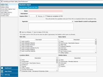 A bulletin is a method used to broadcast specific information about a person of interest or case such as BOLO. Bulletins can be created on the CFS Log Window with an expiration date, message, sequence number and shared with specific agencies and beats.