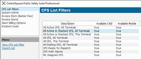 CFS List Filters allows an administrator to create specific filters for the users on the CAD CFS List window. To view the CAD CFS List window, go to CFS Log > New CAD Window > CAD CFS List.