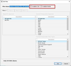 Note: Additionally, each CFS List Filter can be double clicked on, on the top right side of the displayed window check boxes can be selected to determine where this filter should or should not display (i.e., available in CAD or available in Mobile CAD).