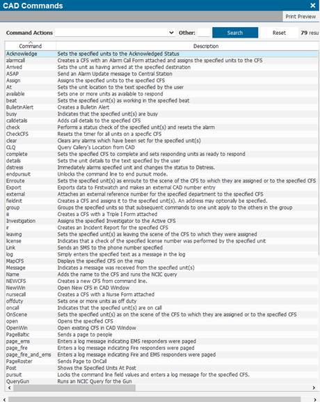 CAD Commands can be configured based on the agency’s needs and are accessible from the command line on the CFS.