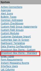 1. Navigate to System Admin > System > Dropdown Box Items – Standard.