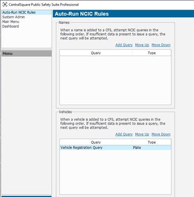 A rule can be configured so that CAD automatically runs queries when a name or vehicle is added to a CFS on the Name and Vehicle tabs and attaches the returns to the CFS. For example, you might configure your system to attempt to run a Driver's License Query by OLN, and if not enough information is available, to then attempt to run a Driver's License Query by Name.