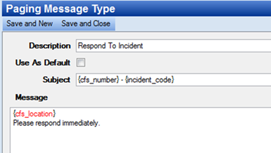 4. Use the available tags shown below in the Subject and Message Line to add more data about the CFS i.e. CFS number, CFS location, Incident Code, etc. When sending a page for a CFS, all the message tags {CFS_number} will be replaced by the corresponding data from the CFS.
