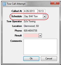 Tow Operator Schedules are used on the Tow Call form. The tow call operator schedules are available on the Log Call Attempt link which can be found on the Tow Call.