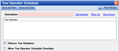 o Enforce Tow Rotations – Check to use the tow rotation. Uncheck if you want the user to be able to select any tow operator
