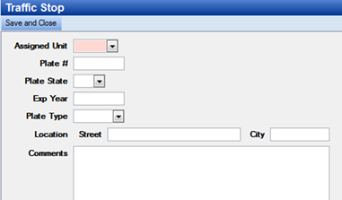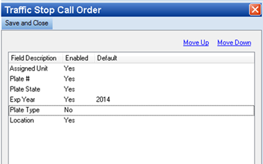 The Traffic Stop Call Order controls the order of the fields on the Traffic Stop form which is available through the New Traffic link on the CFS Menu Window. To control the order of the fields of a traffic stop on the command line, then go to System Admin > CAD > Commands to edit how the fields will display on the Traffic Command.