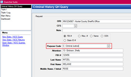 In order for the purpose code to pre-populate in the NCIC queries, the dropdown options must match exactly the dropdown options available in the query form. Both options are configured in System Admin > System > Standard Dropdowns or by pushing F11 while in the field.