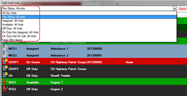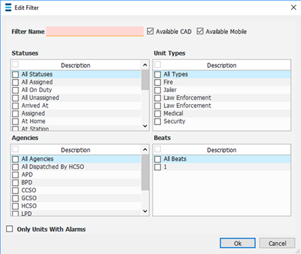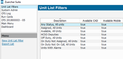 Unit List Filters allows an administrator to create specific filters on the CAD Unit List window. To view the CAD Unit List window go to CFS Log > New CAD Window > CAD Unit List.