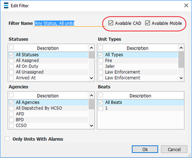 o Additionally, each CFS Unit Filter can be double clicked on, on the top right side of the displayed window check boxes can be selected to determine where this filter should or should not display (i.e. available in CAD or available in Mobile CAD).