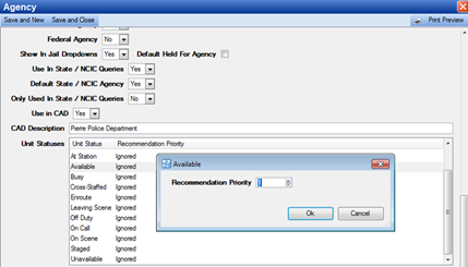 Configure the Recommendation Priorities of the statuses of units by agency. For example, agency one might want all “Available” units recommended first and all “On Call” units recommended second, but agency two wants all “Available” units recommended first and all “Busy” units recommended second.