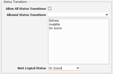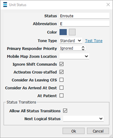§ Allow All Status Transitions - If checked, this option will allow any unit to move from the indicated status to any other status in the system (i.e Available, Enroute, On Scene, ect).